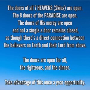 “On the first night of the month of Ramadan, the devils are chained, the jinn are restrained, and the gates of Hellfire are closed and none of its gates are opened. The gates of Paradise are opened and none of its gates are closed. A caller announces: O seeker of good, come near! O seeker of evil, stop short! Allah will save them from the Hellfire and that is during every night of Ramadan.” — (Tirmidhi)